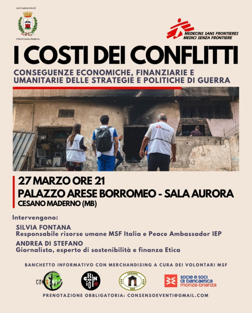 l’incontro vedrà come ospite, Silvia Fontana, responsabile risorse umane di MSF Italia e Andrea Di Stefano, giornalista ed esperto di sostenibilità e finanza etica. L’evento si terrà nella Sala Aurora ( Palazzo Arese Borromeo) il 27 Marzo 26 alle ore 21,00. Si ricorda che per motivi di sicurezza la prenotazione è obbligatoria. per iscrizione, inviare una mail a : consensoeventi@gmail.com